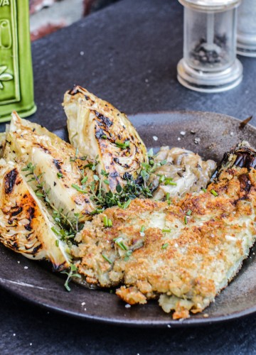 Aubergine Schnitzel, Wild Mushroom Sauce & Grilled Hispi Cabbage with Miso Butter