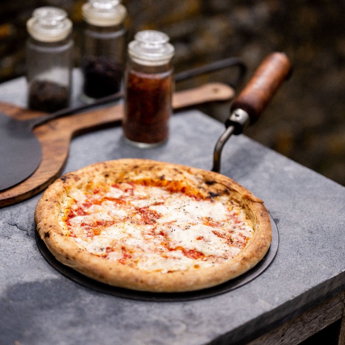 Pizza Pan for Wood Fired Oven, made from durable mild steel with a hardwood handle.