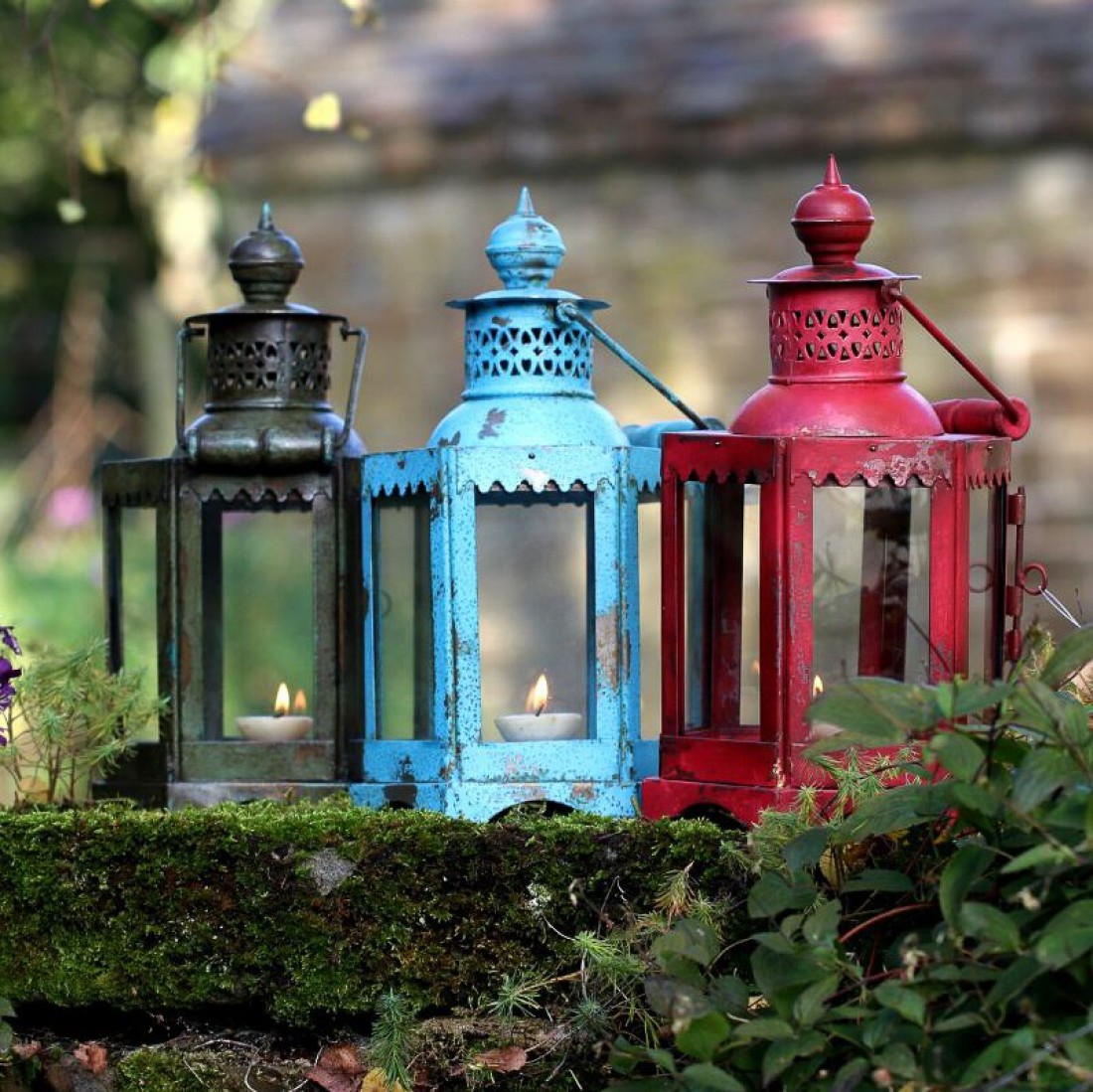 Our traditional Mogul Lanterns come with 6 glazed sides and candle holder in the base. Available in distressed blue, green and red.